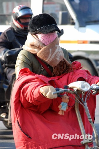 山东滨州市民冒着严寒出行。中新社发 张滨 摄