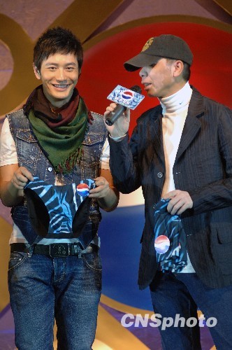 图为黄晓明、冯小刚获赠泳裤,寓意下次合作广告可以到“夏威夷”拍摄。中新社发 李学仕 摄