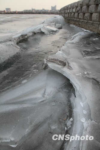 当日,山东沿海出现近30年来同期最严重的海水结冰现象,黄海北部海域近岸20海里、渤海湾近岸15.5海里的海水出现结冰,冰层最厚接近一尺。中新社发 梁宝海 摄