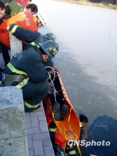 消防官兵将落水老人从冰河向岸上转移。中新社发 万善朝 摄
