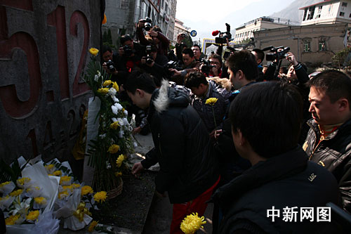 乒乓球员在北川地震遗址祭拜遇难同胞。张浪 摄