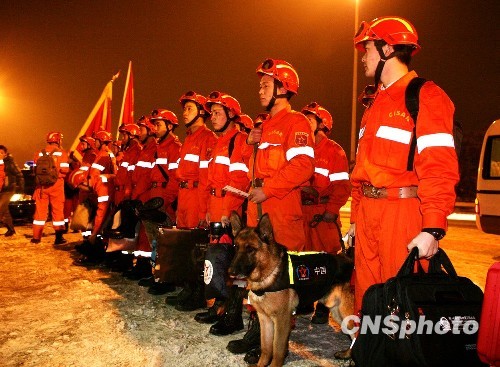 1月13日晚,中国国际救援队从首都国际机场搭乘飞赴海地执行救援任务。据悉,救援队一行共计68人,由三个分队组成,包括来自国家地震局的10人专家分队等。据了解,救援队随机携带了总价值约1200万元人民币的10余吨救灾物资,其中包括救援、通讯、后勤保障、医疗、食品在内等物资设备和三只搜救犬。中新社发 雷虹 摄