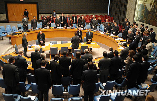 1月13日,在美国纽约联合国总部,联合国安理会在当日公开辩论会正式开始之前,应安理会本月轮值主席、中国常驻联合国代表张业遂的提议,联合国秘书长潘基文、安理会各理事国代表及相关与会人员全体起立,为海地强烈地震中的遇难者默哀1分钟。新华社记者 申宏 摄