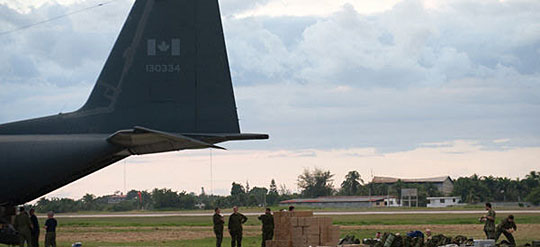 在海地首都太子港,刚刚抵达的加拿大救援人员搬运救援物品。