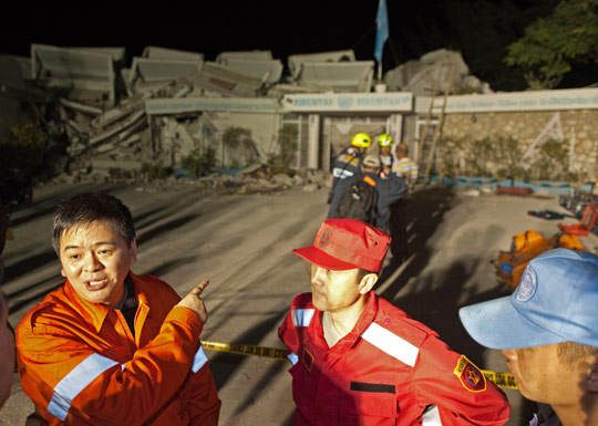 当地时间1月14日,中国国际救援队在海地首都太子港展开救援。