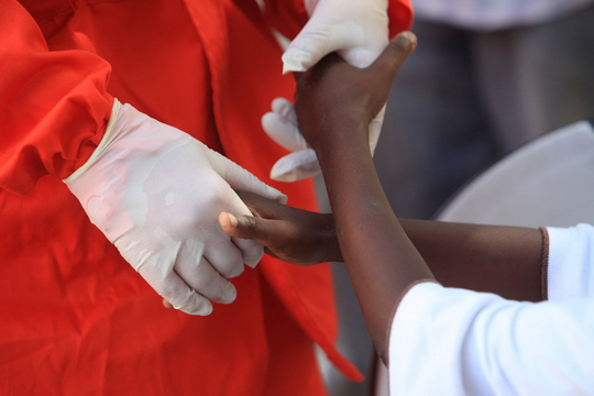 医务人员拉着小朋友的手安慰他。邢广利 摄