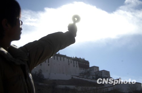 拉萨市民观看“偏食”。中新社发 程朱荣 摄