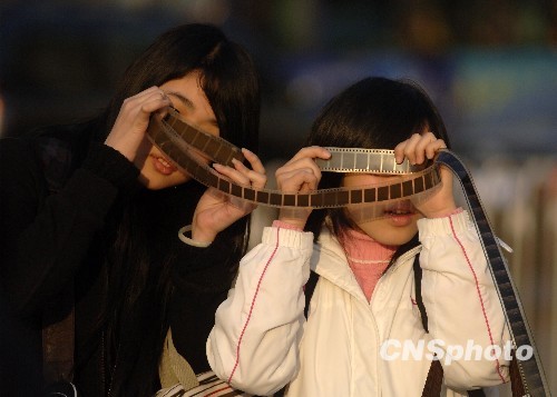 图为两名女孩通过深色底片观看日食。中新社发 王东明 摄
