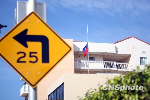海地驻迈阿密总领馆上方,一面红蓝底色的海地国旗几天来一直处于降半旗状态。中新社发 孙宇挺 摄
