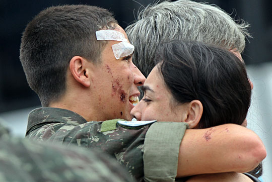 受伤的巴西驻海地维和部队士兵与家人拥抱。