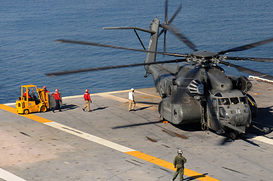 在美军“卡尔·文森”号航空母舰的甲板上,救援人员把物资装载到一架MH-35E直升机上。