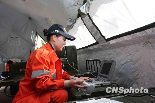 武警总医院赴海地国际救援医疗队员张雪梅正在调试便携式B超机。中新社发 武警总医院供稿 摄