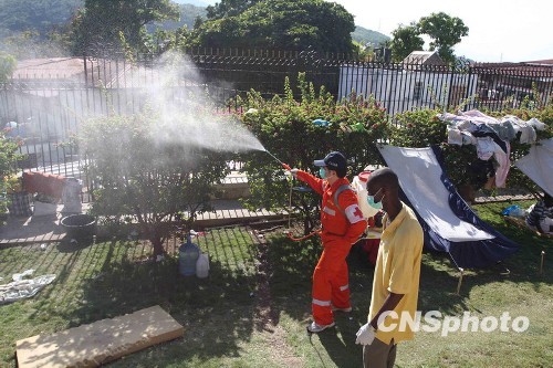 武警总医院赴海地国际救援医疗队员正在为难民营做消毒防疫工作。中新社发 武警总医院供稿 摄