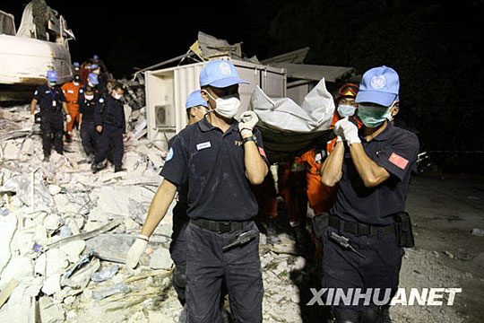 1月16日,在海地太子港,中国维和警察防暴队队员在联合国驻海地稳定特派团倒塌大楼现场抬出一具中方失踪人员遗体。袁满 摄