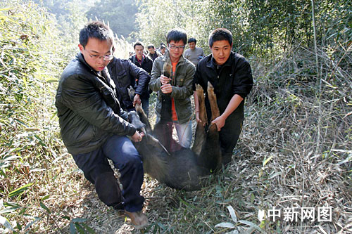 这只苏门羚有一百多公斤重,四个彪形大汉才把它抬起来,放到空旷处医治。 小小 摄