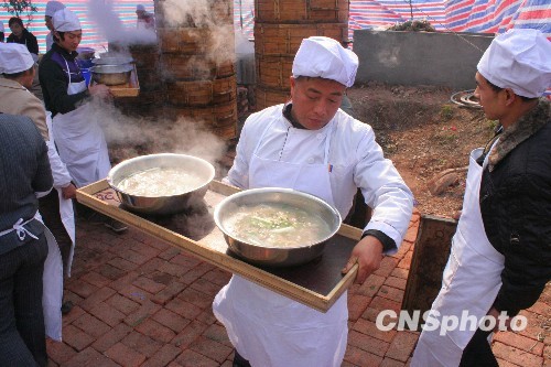重庆市荣昌县昌州街道办事处石河村,丰盛的刨汤宴开始上席。中新社发 朱芸锋 摄