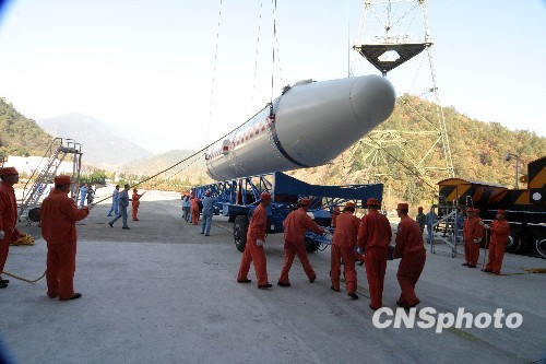 图为发射前,运载火箭在发射场区进行吊装。中新社发 邓孟 摄