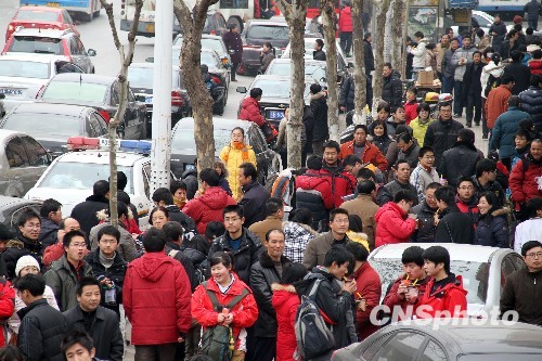 南京中华职业教育中心考点接送考生的车辆排成长龙。中新社发 阿董 摄