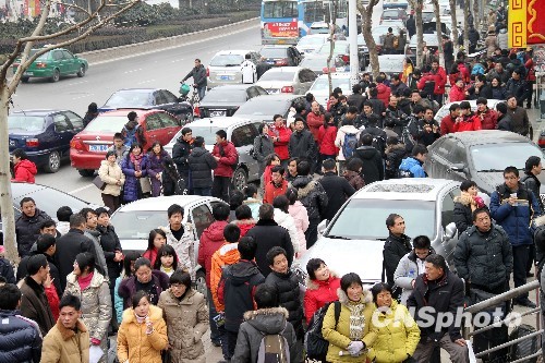 南京中华职业教育中心考点接送考生的车辆排成长龙。中新社发 阿董 摄