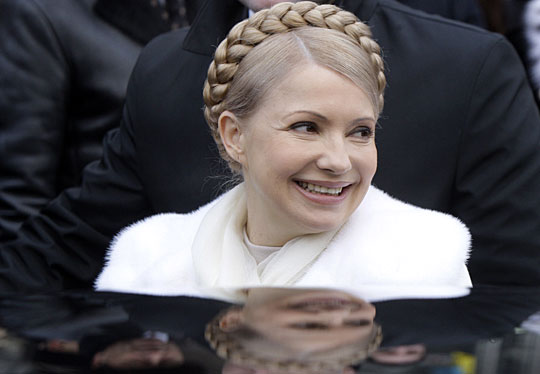 图为乌克兰现任总理季莫申科在投票站外准备离去。