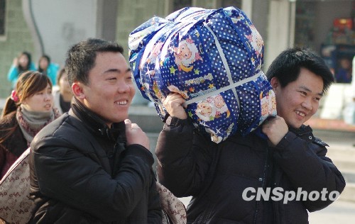 2010年1月17日,离2010年春运还有10多天时间,苏州火车站提前出现了春运前的客流小高峰。大批提前回家过年的外来务工人员与部分放寒假返乡的高校大学生聚集车站。中新社发 苏民 摄