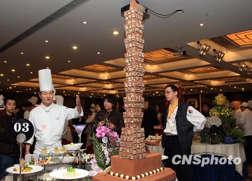 1月18日,迎世博上海旅游饭店行业服务演练大赛在上海举行,台湾厨师用精美的巧克力雕刻成“台北101”,吸引同行与观众眼球。中新社发 潘索菲 摄