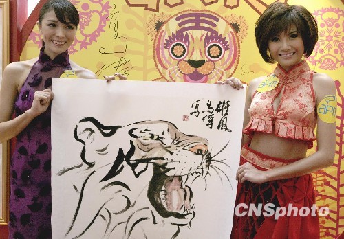 1月18日,香港一家商场举办中国画家高伟国家级老虎名画展,展出的老虎绘画作品让市民体会“虎”年的浓厚气氛。