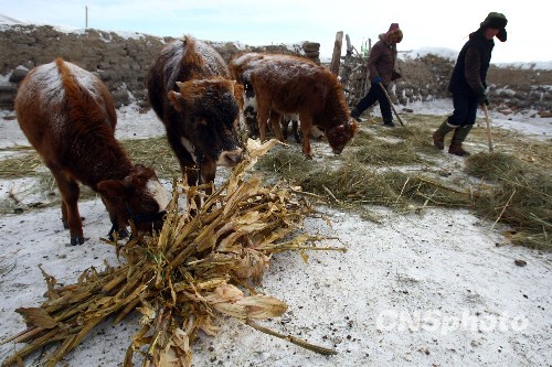 1月18日,新疆阿勒泰巴里巴盖乡牧民正在将牛圈里的零散牧草收拢起来,以便节约更多的牧草应对低温强降雪灾害。据了解,该乡距阿勒泰市52公里,由于近日再次遭遇强降雪天气,造成牧草供应不足,当地政府正与金融部门积极筹备,为农牧民发放小额贷款用于购置过冬牧草,以解燃眉之急。