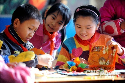 春节前夕,沈阳市西塔街第一小学在寒假里开展“制环保贺卡 倡导低碳生活”活动,学生们利用旧挂历、植物叶、废旧布块等原材料,精心制作了别具新意的环保贺卡,送给家长和亲朋好友进行“环保传情”,向大家倡导环保低碳的生活理念。