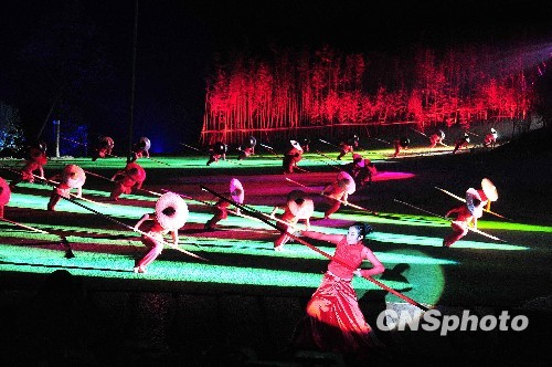 1月18日晚,一片红色的竹竿,轻轻一挑,360度旋转舞台,带领观众进入“大红袍印象”山与水。九曲竹排,美仑美焕。当晚,“大红袍印象”在武夷山试演。中新社发 张丽君 摄