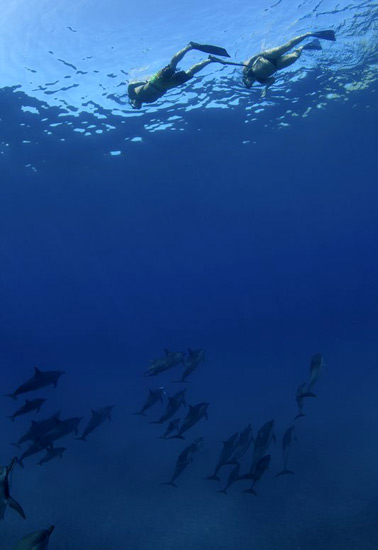 30岁的Brianne Droscoski和35岁的Jen Groark是好朋友,当她们结伴下海时,发现有许多海豚来到了她们附近。其中一只显然被她们凸出的肚子吸引住了,就在她们身边游来游去。有些科学家相信,海豚可以感知到肚子里的胎儿,甚至还能辨别胎儿的性别。