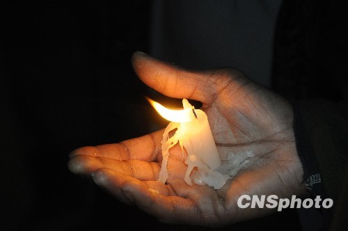 图为烛光守夜活动上,一名海地人将烛光放在沧桑的掌心。中新社发 吴庆才 摄