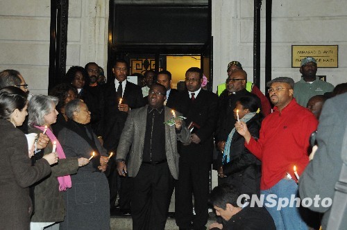图为烛光守夜活动上,一位海地驻美外交官高唱圣歌为遇难同胞祈祷。中新社发 吴庆才 摄