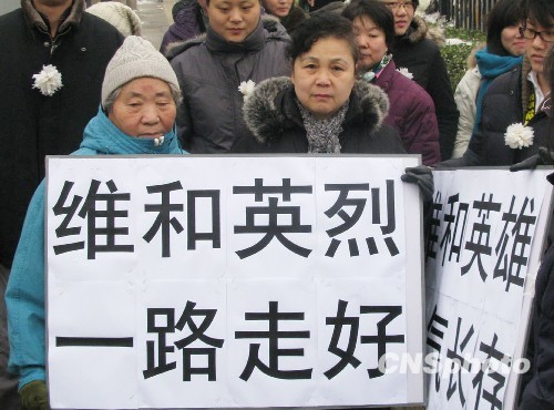 1月19日,北京民众自发守候在通往北京八宝山殡仪馆的路口迎接英烈的灵柩。当日,八位海地地震遇难中国维和警察的灵柩搭乘专机将抵达北京。中新社发 张子扬 摄