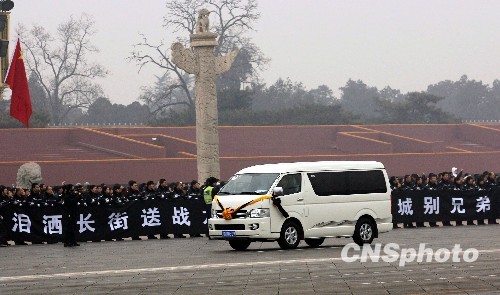 1月19日,众多民众市民和公安干警在长安街送别在海地地震中遇难中国维和警察。灵车经过天安门前时,警察队伍打出“泪洒长街送战友,恸彻京城别兄弟”的横幅。当日,八位海地地震遇难中国维和警察的灵柩搭乘专机抵达北京。中新社发 苏丹 摄