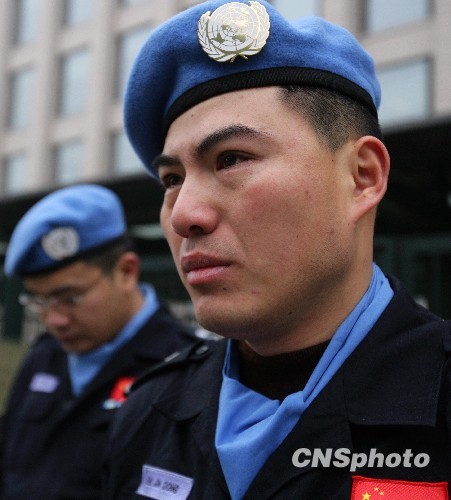 1月19日上午,在海地地震中牺牲的八位中国维和警察遗体回国,公安部门前,众多警察前来迎接牺牲战友。图为第四支赴海地维和警察防暴队的施金东接受媒体采访。施金东是公安部边防管理局政治部宣传文化处的一名干事,2006年8月至2007年4月,作为第四支赴海地维和警察防暴队的一员参加海地维和任务。