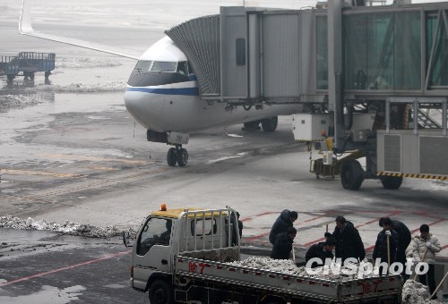 1月19日下午,北京首都国际机场工人加紧清除半个多月前的积雪冻冰。北京气象台当日上午发布寒潮蓝色预警,强冷空气将于20日(农历大寒)抵达北京,城市平原地区最低气温将降至零下12摄氏度。