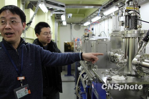 上海光源束线工程部主任肖体乔研究员介绍光源内的科研仪器设备。中新社发 孙自法 摄
