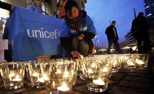 1月19日,在德国美因茨,一名联合国儿童基金会成员点燃蜡烛参加为海地祈祷的活动。