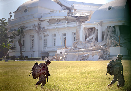 图为美军士兵正在徒步通过被地震严重损毁的海地总统府前的草坪。