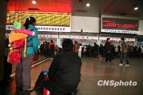 1月20日,成都火车站开始发售春运火车票,实名制普通车票也将于2月4日开始发售,目前成都火车站正迎来学生返家高峰。图为在成都售票厅歇息的一家三口。中新社发 张浪 摄