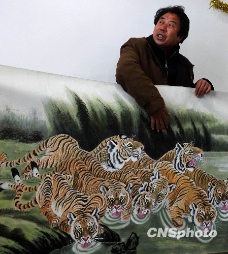 2010年1月20日,孟津县常袋乡常袋村63岁的农民画家郭荣城在展示了他历时一年半精心绘制的一幅工笔画《百虎图》。 在长27米、宽1.1米的《百虎图》,100只形态各异的老虎分别在春夏秋冬不同的季节或环境中,或捕猎,或饮水,或嬉戏,或休闲。郭荣城期待这幅“百虎寓百福”的工笔画在即将到来的虎年捐献给希望工程,为孩子们贡献自己的微薄力量。