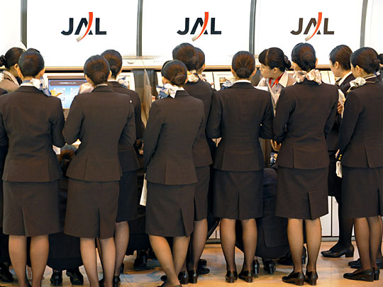 图为日本航空公司空乘人员正在准备登机。