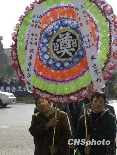 1月21日中午,在海地大地震中遇难的云南省赴海地维和警察防暴队李钦、钟荐勤、和志虹3位烈士的骨灰由专机从北京运抵昆明。图为十余位老年市民高举花圈迎接三位烈士回家。中新社发 田洪 摄