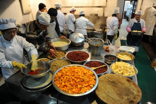 1月22日凌晨,北京广化寺的十几名居士熬制腊八粥。广化寺的十几名居士自21日早晨6点就开始准备原料,22日下午三点开始用两口大锅同时开熬,今年预准备至少30桶粥,居士们将通宵工作,尽量保证前来排队的市民都有粥喝。朱嘉磊/CFP