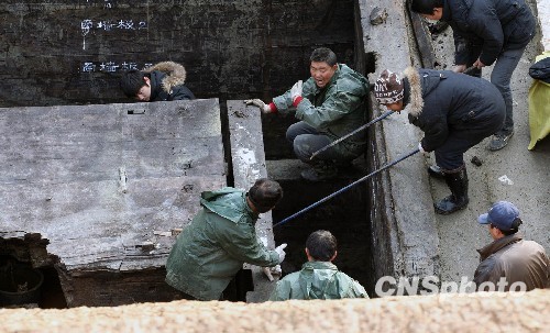 1月21日,湖北荆门严仓古墓考古发掘又有多批竹简、兵器、铁器、漆木竹器残片、铜套饰、生活用具和甲片等器物出土。1月20日下午,中部棺室外围已清理完毕,横纵隔梁被抬出墓坑,预计将继续对棺室进行清理。严仓古墓距楚都纪南城约25公里,系以纪南城为中心的高等级墓群的组成部分之一。中新社发 付永锡 摄