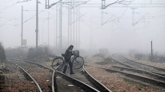 近日,印度新德里大雾弥漫,严重影响交通出行,部分火车和航班延误。图为21日,在新德里,一名男子搬着自行车走过铁轨。