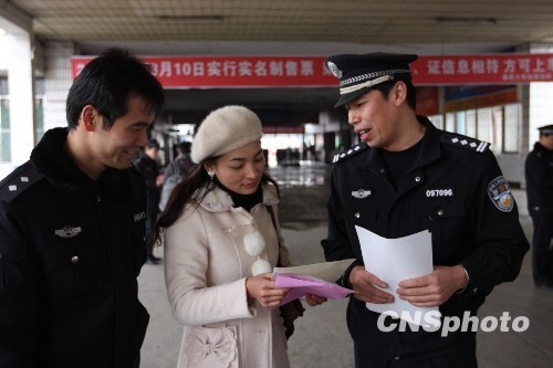 湖南娄底市火车站派出所民警向群众发放火车票实名制售票宣传资料。中新社发 郭国权 摄