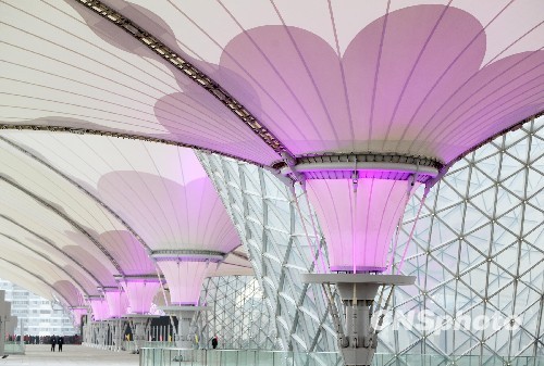 1月22日,上海世博会最大的单体工程、世博会“一轴四馆”永久场馆之一的世博轴工程正式竣工。当日,在世博园区举行的竣工仪式吸引了海内外众多媒体前来报道。据悉,世博轴是由地上二层地下二层组成的立体交通枢纽,长约1045m、宽约130米。总占地面积约13万平方米,总建筑面积25.1万平方米。工程采用了生态设计理念,首次采用了阳光谷结构,自然光透过阳光谷玻璃倾泻入地,可满足部分地下空间的采光、通风,提升地下空间的舒适感,并节约大量能源。中新社发 汤彦俊 摄