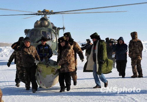 因雪灾被困阿勒泰山区严重冻伤的非法淘金者被救援人员抬下直升机。据介绍,因连续强降雪天气,共有21名非法淘金者分别被困在阿勒泰市切木尔切克乡的哈拉尕特山区和祖喀拉尕依山区,应当地政府请求,新疆军区1月21日紧急派出两架直升机前往救援。目前,已有14人被成功救出,仍有7人失踪。中新社发 刘新 摄
